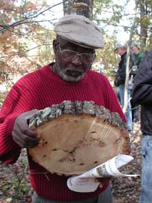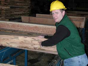 ![]() Bruce Moltzan points to R.O.B. defect in cut logs. |