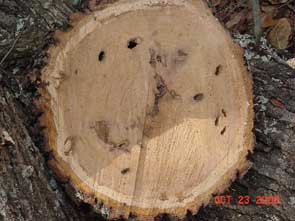 ![]() Red Oak Borer damage in logs. |